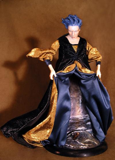 19 inches. OOAK. Super Sculpey, paper mache and fabric. Status: AVAILABLE. For price contact the artist. |