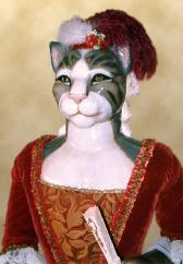 | "Miaow Antoinette in red" A whimsical homage to the controversial Queen of France, this exquisitely sculpted cat-lady is dressed in a stunning costume tailored in silk, fine velvet and hand painted fabrics, reminiscent of the 18th Century period. She stands on an elegant upholstered base of black suede and is holding a real fan in her hand. |